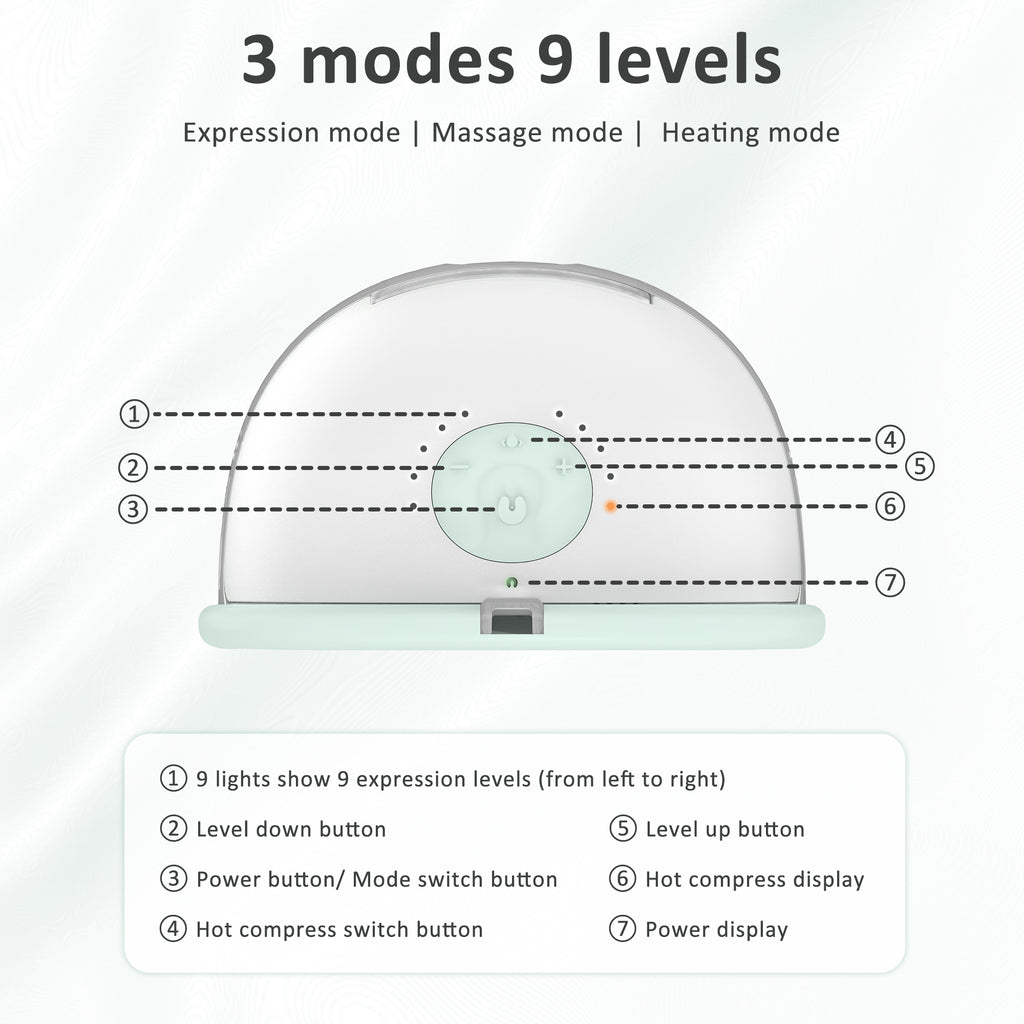 • Modes: Massage, Expression, Heating; 9 suction levels